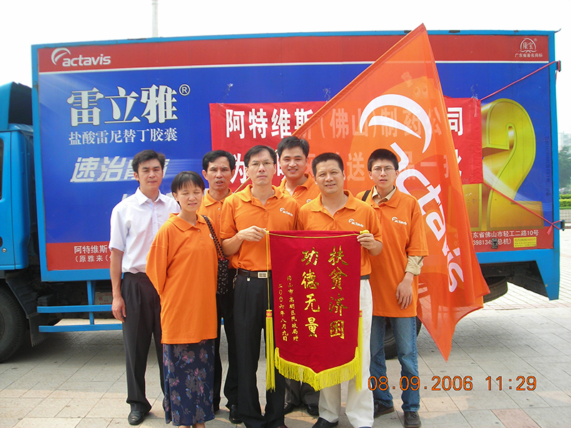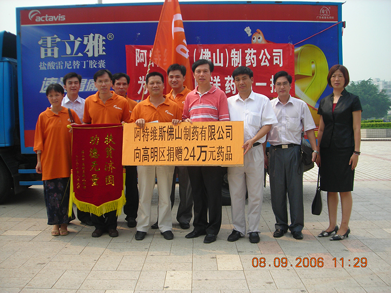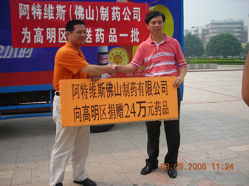 2006年,佛山手心制藥向受臺風(fēng)影響的佛山市高明區受災群眾捐贈一批價(jià)值24萬(wàn)元的疾病預防控制藥品,包括腸胃藥、抗生素和維生素,用于開(kāi)展向受災群眾送醫送藥義診活動(dòng)。