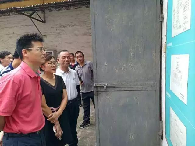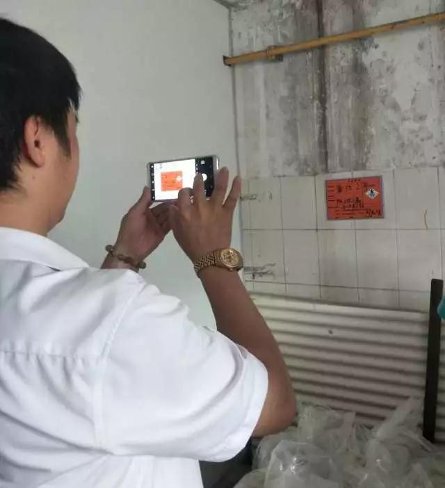 △李局在危廢品倉門(mén)前觀(guān)看手心制藥的環(huán)境安全管理規范示意圖。
