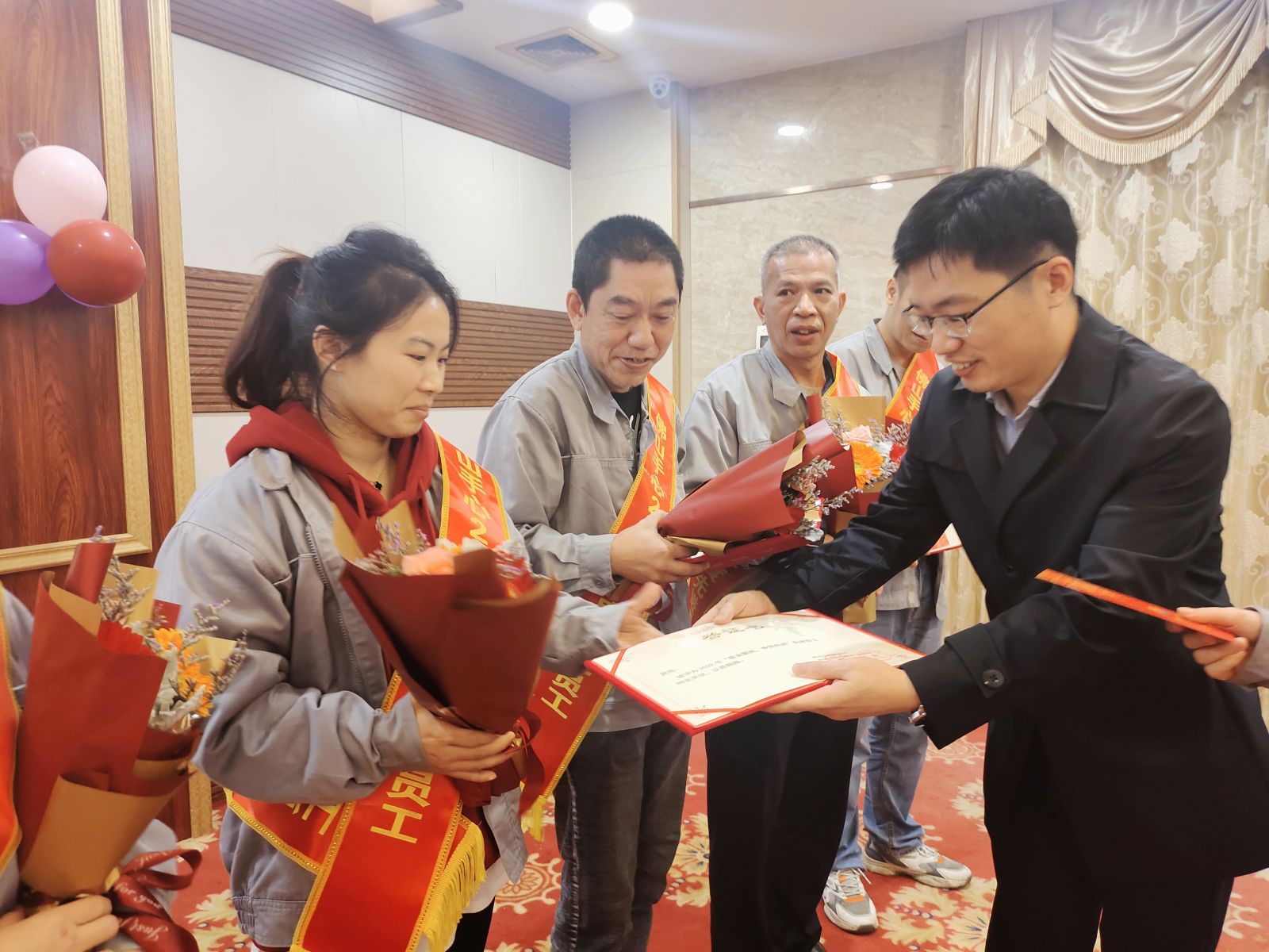 △獲獎人從右至左:廖源文(倉庫及配送部先進(jìn)一線(xiàn)員工)、曾海華(工程部先進(jìn)一線(xiàn)員工)劉衛雄(車(chē)間先進(jìn)一線(xiàn)員工)、申學(xué)忠(車(chē)間先進(jìn)一線(xiàn)員工)、鐘毅華(車(chē)間先進(jìn)一線(xiàn)員工)、黃艷(車(chē)間先進(jìn)一線(xiàn)員工)